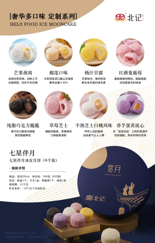 2022中秋节,北记食品以20年食品研发和生产经验,从健康食材和制作工序中汲取灵感,推出高颜值冰皮月饼!“北记高颜值冰皮月饼”是福建北记食品旗下最新推出的应季系列产品。北记冰皮月饼秉承了北记食品一贯的高颜值,高品质,多层夹心馅料搭配上冰激凌一般清凉细腻的口感,让每一口都Q弹香糯,八种缤纷口味,更是满足不同人群所需。