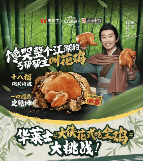 为了让“丐帮帮主”的形象更深入人心,华莱士还官宣了人气明星杨迪为全新品牌代言人暨全鸡推广大使,并携手杨迪发布广告宣传片。在广告片中,杨迪化身丐帮继承人向丐帮老帮主请教丐帮秘籍,丐帮帮主将华莱士全新新品叫花鸡做法传授于他并告诫其“以武服人,不如以味会友”的心得,以此彰显华莱士在江湖里深藏不露的地位,并向大众传递“以味交友”的理念。同时,全平台上线#大侠花式吃全鸡 话题,发起二创征集活动,邀请各位网友晒出自己吃鸡时的照片或视频,鼓励消费者探寻吃鸡的更多方式的同时,还能赢得美的烤箱等礼品。