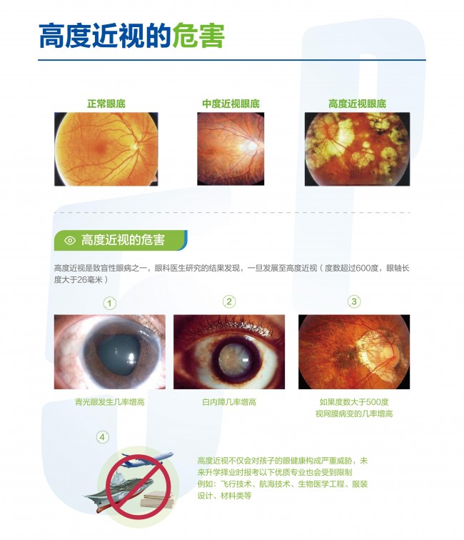 相比于低中度近视,高度近视因眼轴过度延长、屈光度数不断增长,大大增加进展为病理性改变的风险。高度近视人群中,白内障、青光眼、近视性黄斑变性、视网膜脱离、近视性视神经病变等致盲性眼病发病率明显高于正视人群。病理性近视引起的视网膜病变已经成为中国不可逆性致盲性眼病的首要病因。