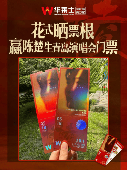 福利2:即日起-5月13日,晒出你秀华莱士联名活动套餐/华莱士版纪念票根的照片,带话题#华莱士陈楚生青岛演唱会# ,发微博并@华莱士官方微博,华莱士讲选2位幸运的歌迷【送陈楚生青岛演唱会门票】!