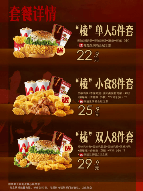 据悉,即日起到5月17日,华莱士????全国2万家门店将同步上市华莱士X陈楚生《棱》巡回演唱会联名套餐,通过华莱士小程序自助点餐小程序点联名套餐,就会随套餐附赠最能代表演唱会的纪念物——华莱士版纪念票根,以此将巡演中的美好传递给全国各地的“花生”。纪念票根数量有限,每家门店限量50张,先到先得,粉丝可提前电话联系门店确认,以免跑空。