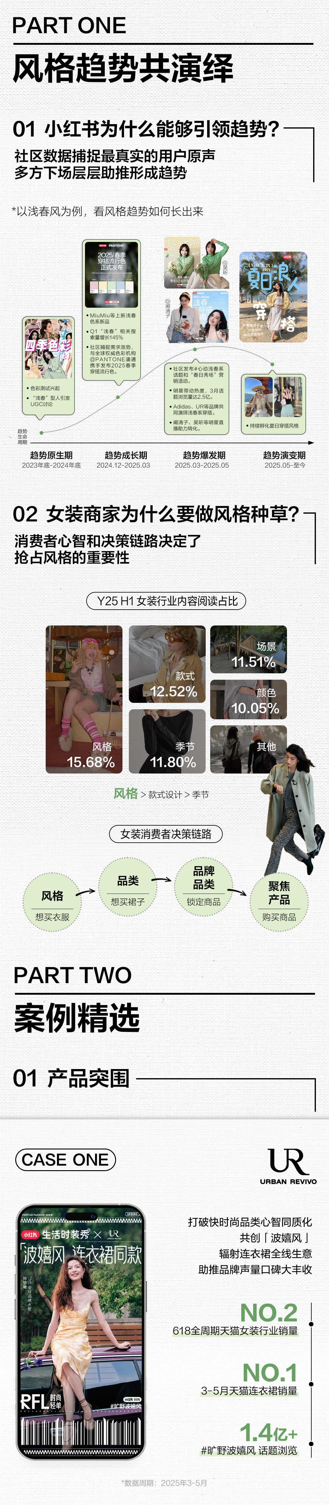 在小红书,风格种草已成为一种趋势。以「浅春风」为例,该风格从2023年底出现,历经趋势「原生期-成长期-爆发期-演变期」的完整周期沉淀,至今仍保持旺盛的生命力。从2025年上半年小红书服饰潮流行业的内容数据来看,风格类内容的阅读占比已显著领先于款式设计季节主题类内容。对于品牌而言,精准捕捉并驾驭风格趋势,就是掌握了撬动消费者决策的核心密码。
