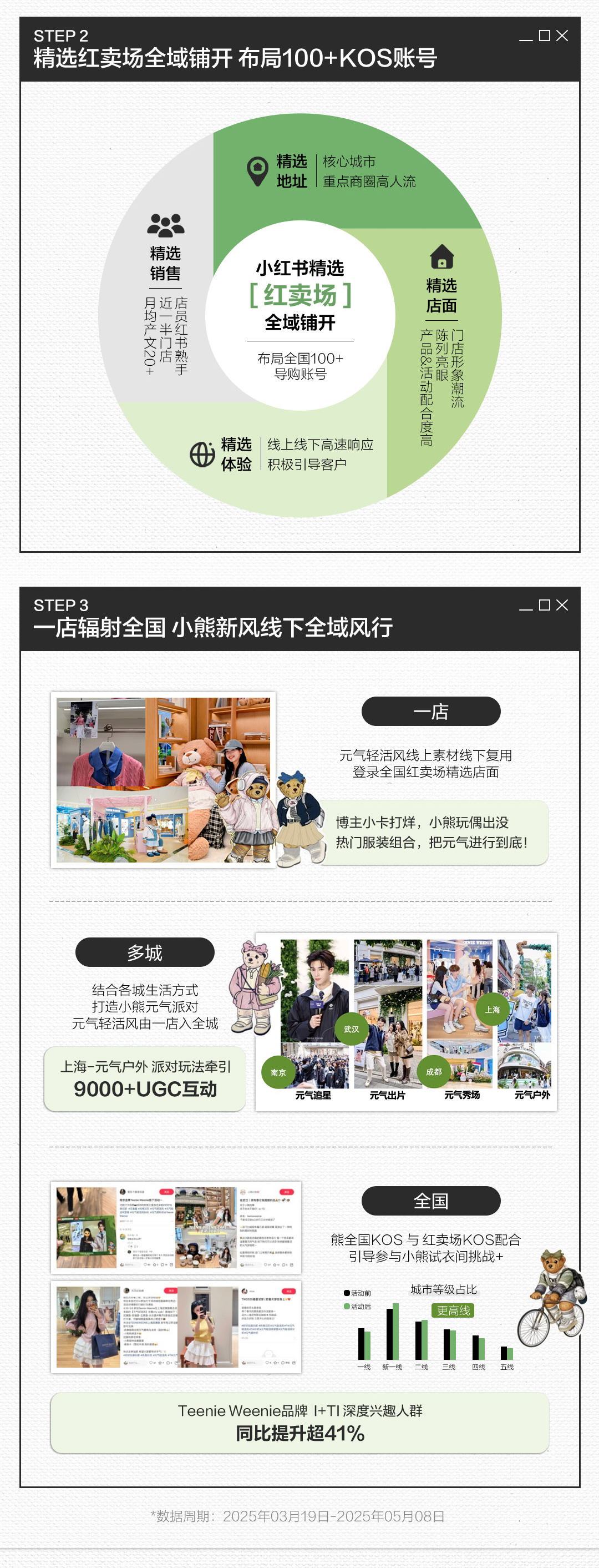 通过风格种草,实现从「传统学院风」到「元气轻活风」的华丽转身,布局100+KOS账号,全域承接线上流量;一店辐射全国,小熊新风线下全域风行。