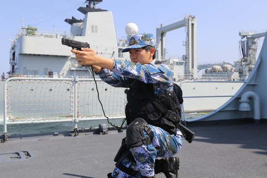 宋玺:每一名军人都想有机会能去护航,我也不例外。当时护航主要是从事部队政治文化工作,平常训练会跟特战队队男兵一起训练,有时有海军国际交流我也会参与。