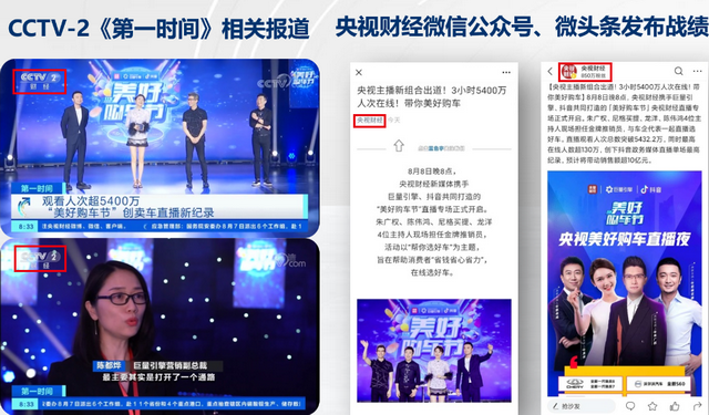 (6)播后传播跟进:直播结束后,CCTV-2《第一时间》对活动和合作企业进行了采访和报道;“央视财经”公众号、微头条发布战绩。合作企业取得了品效合一的完美营销效果。