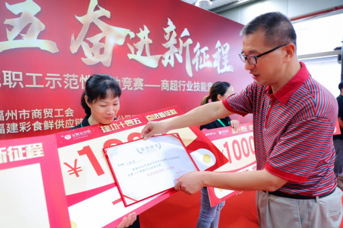 随后,福州市商贸工会主席吴厚烽强调,本次赛事积极响应国家“十四五”规划,深入学习贯彻习近平总书记关于工人阶级重要论述和来闽考察重要讲话精神,围绕坚持“3820”战略工程思想精髓,全面展示了新时代商超行业职工干部的技能和风采;他希望企业广大干部职工要立足岗位、创先争优、勇于担当,顺应经济转型对技能人才的需求,充分发扬劳模精神、劳动精神、工匠精神,继续推动福州市商超行业繁荣发展,谱写新时代福州商贸工会改革发展新篇章,以蓬勃昂扬的精神风貌和优异的成绩迎接建国73周年和党的二十大胜利召开。