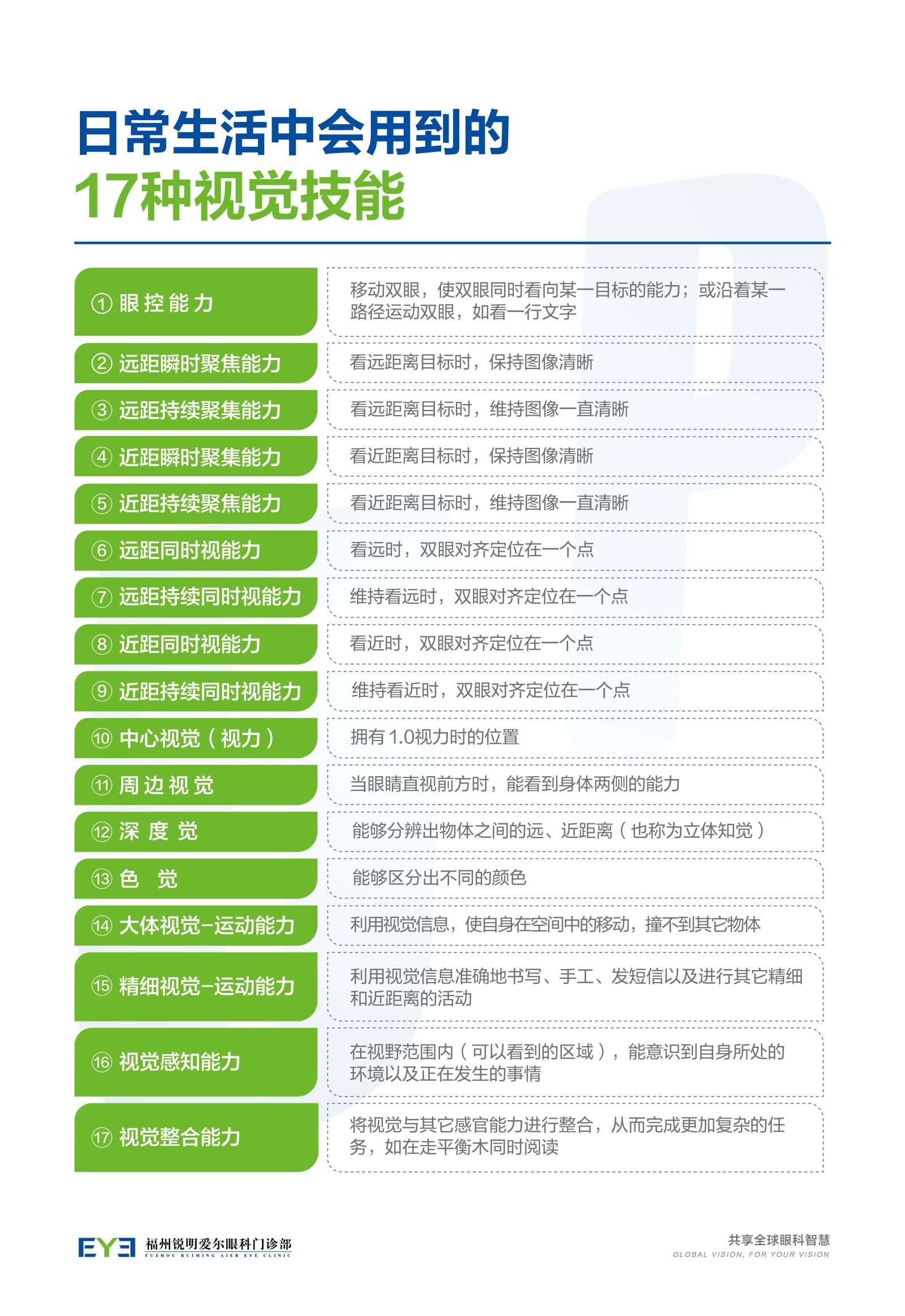 同时,视觉训练需结合在院训练和家庭训练以保证训练效果。因为在院训练主要是学习和应用医生教授的训练方法调整用眼技巧,而家庭训练主要是巩固所学视觉技巧的过程,以保证足够的训练强度,进而逐渐从有意识的用眼转变为和正常人—样能够无意识的自主用眼。