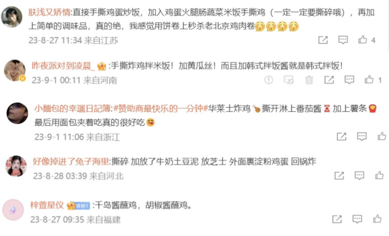 凭借“花式吃全鸡七天不重样挑战”活动,华莱士在年轻消费者群体中掀起一股风格独特的“美食社交”潮流,完成了与消费者的“品牌共创”。在微博上,网友们纷纷上传自己用华莱士全鸡制作的创意料理,有用蜜汁手扒鸡制作的凉拌手撕鸡、用脆皮鸡做的香酥辣子鸡、有鸡肉和薯条混搭挤上番茄酱做的创意料理,还有网友复刻出节目同款美味竹笋鸡……甚至老乡鸡也和华莱士来了个“梦幻联动”,用“鸡语”无障碍交流。通过挑战活动,华莱士成功打造了品牌与消费者、消费者与消费者之间激发创意的多维社交场景,“花式吃全鸡”更成为风靡年轻群体的新社交时尚,已显现出优秀IP所具有的特性与生命力。