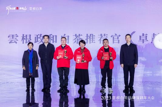 在云根这几年高速高速发展的历程中,涌现出了一大批优秀的经销商群体,云根精心准备了奖杯和丰厚的礼品,大会上,主持人宣读2023年云根政和白茶推介官“卓越贡献奖”“年度新星奖”“优秀合作伙伴”,并逐一揭晓获奖名单进行颁奖,全场掌声雷动,此起彼伏!